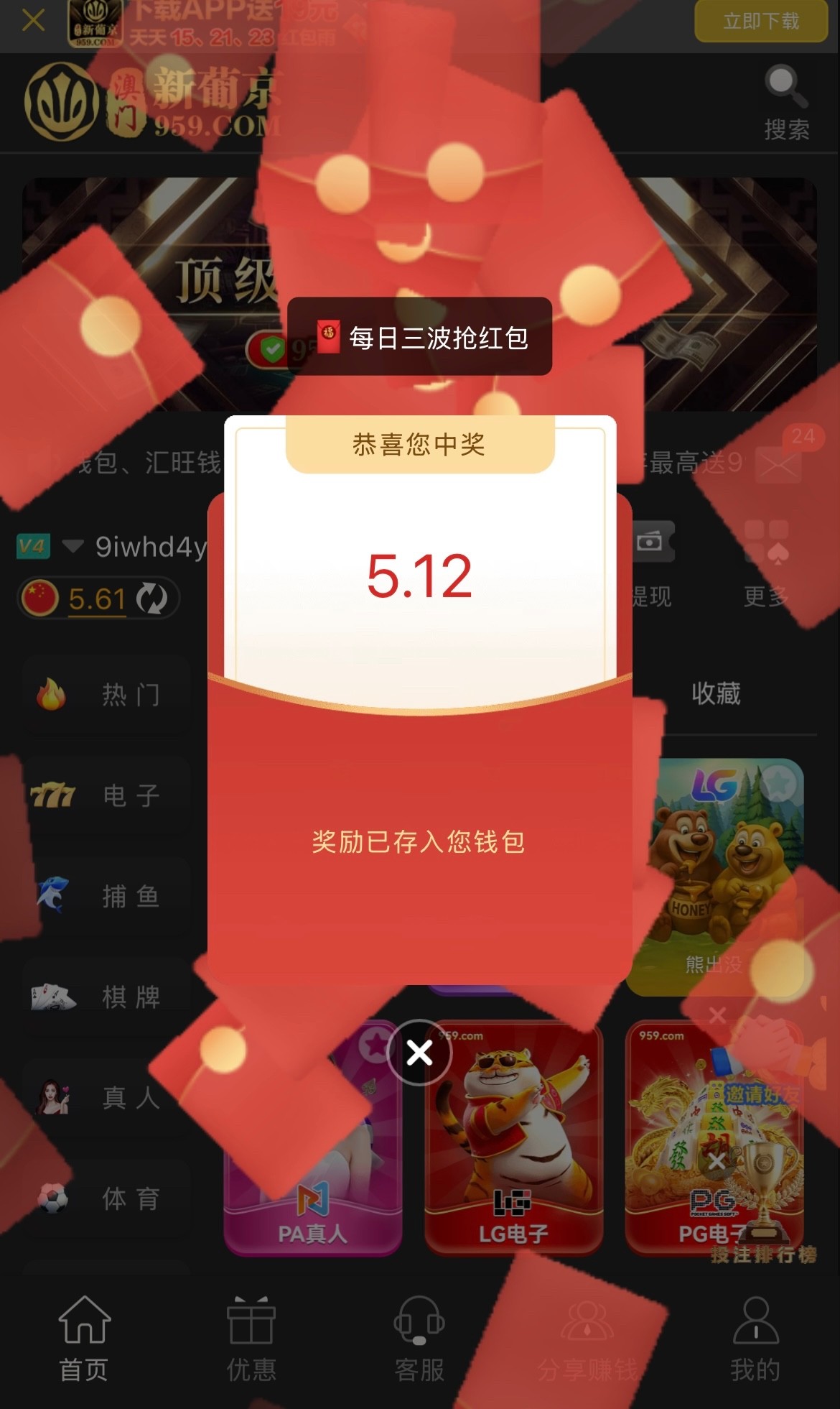 每天有三次抢红包的机会,看运气吧,还看活跃度,我号有五个,每天都能抽到一个比较大额的,然后再玩pg打出来 ,959.com 不要骂我