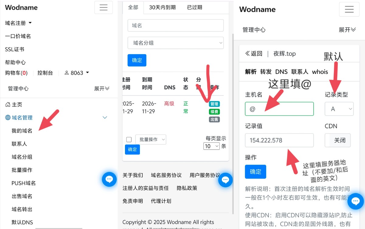 注册>搜索你想要购买的域名>付款(支持USDT和微信充值)>完成等待十分钟左右注册成功